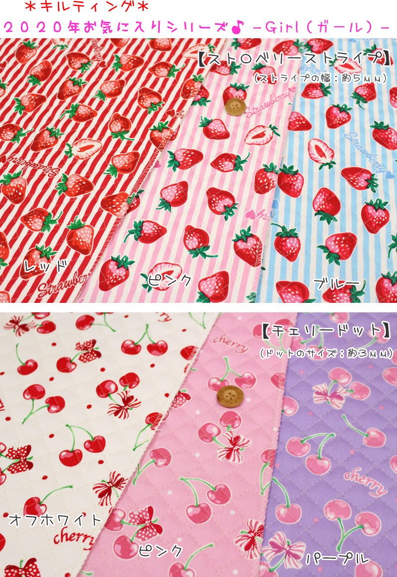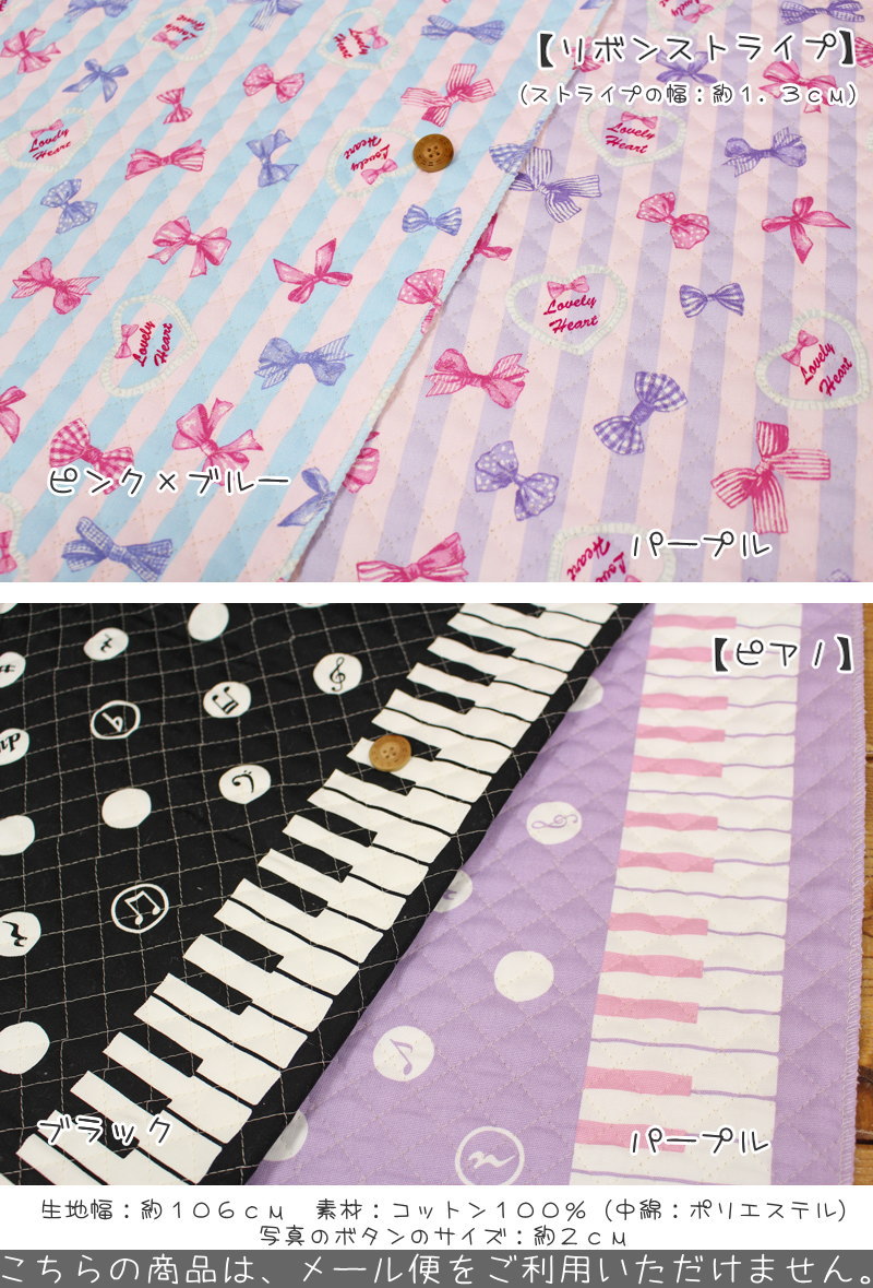 素材:コットン100%(中綿ポリエステル) 生地幅:約106cm ※こちらの生地に合うオススメの糸の色は ≪ストロベリーストライプ≫ 【レッド:13番】 【ピンク:7番】 【ブルー:85番】 ≪チェリードット≫ 【オフホワイト:生成】 【ピンク:5番】 【パープル:243番】 ≪リボンストライプ≫ 【ピンク×ブルー:2番】 【パープル:43番】 ≪ピアノ≫ 【ブラック:黒】 【パープル:243番】 になります。