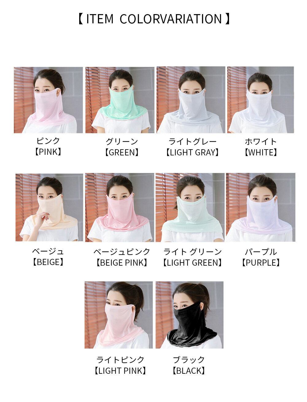 【商品名】 フェイスカバー ネックガード フェイス UVカット イヤーフック付き 自転車用 バイク用 サイクリング 鼻部分開口で呼吸しやすい 息苦しくない 冷感 日焼け防止 紫外線対策 ハイキング 男女兼用 【品番】 fs-uw23 【カラー】 スイカレッド、ホワイト、ライトイエロー、ピンク、グリーン、ライトグレー、ベージュ、ベージュピンク、ライトグリーン、パープル、ライトピンク、ブラック、ブルー 【サイズ】 Free Size 【素材】 ビスコース生地 【生産国】 中国 【製品について】: *花粉が鼻や口に入るのを防ぎ、感染を防ぎます。