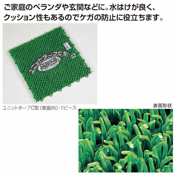 関連商品・サイズ バリエーション つなげる人工芝 ユニットターフC型(家庭向) 【300×300mm】(テラモト MR-002-778-1) 人工芝 ユニットターフC型ロール 【60cm×9m】(テラモト MR-002-710-1) ユニットターフ 角ふち 【75×75mm】(テラモト MR-002-691-9) ユニットターフ 中ふち 【75×300mm】(テラモト MR-002-693-9)
