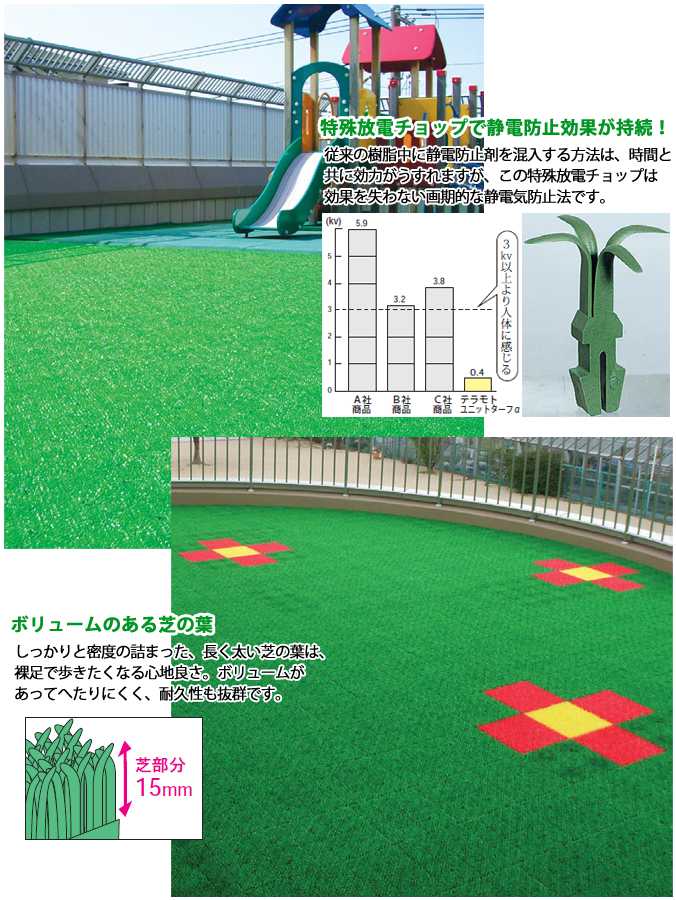 つなげる人工芝(業務用) 静電気を防止する放電チョップ付きの人工芝。