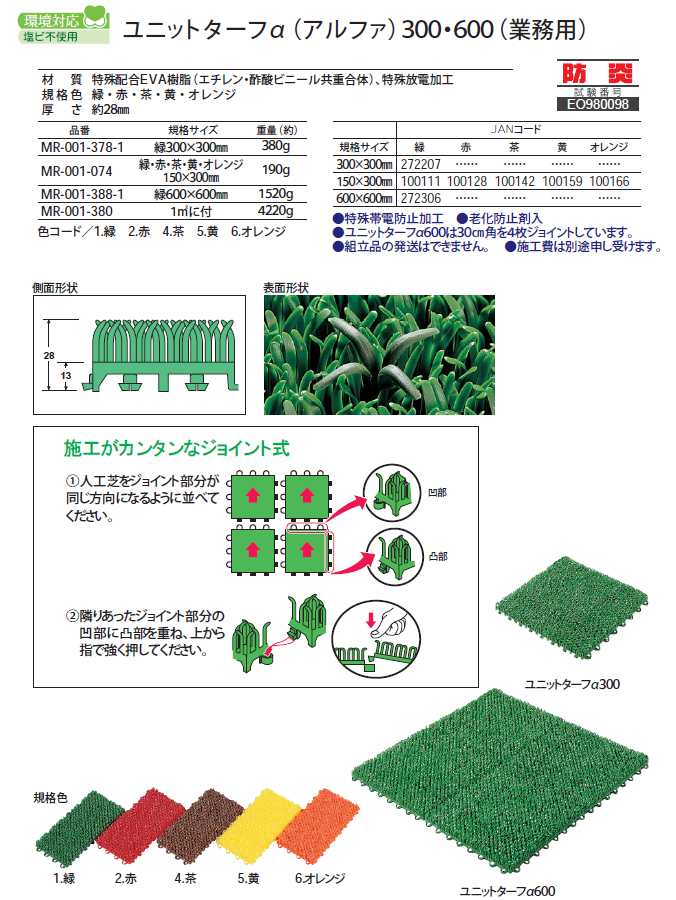 サイズ:150mm×300mm 材質:特殊配合EVA樹脂(エチレン・酢酸ビニール共重合体)、特殊放電加工 カラー:緑、赤、茶、黄、オレンジ 厚さ:約28mm 重量:約190g ●特殊帯電防止加工 ●老化防止剤入 ●ユニットターフα600は30cm角を4枚ジョイントしています。