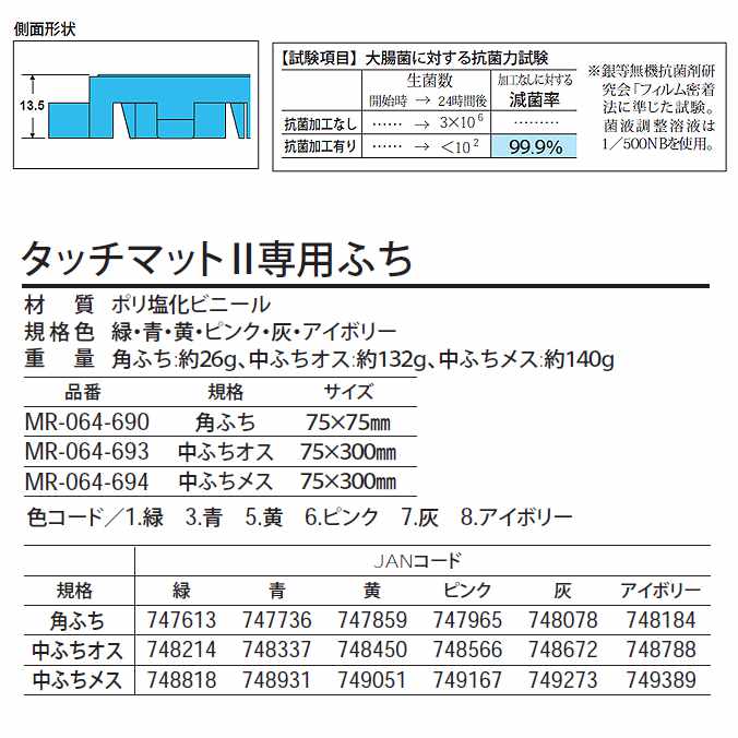材質:ポリ塩化ビニール 規格色:緑・青・黄・ピンク・灰・アイボリー サイズ:75×300mm ●抗菌加工 ●組立品の発送はできません。