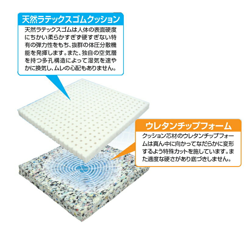 【特徴】 ○柔らかく優れた耐圧分散機能を発揮 ○天然ラテックスのクッションと特殊カットしたウレタンチップフォームの組合せで底付きしない絶妙な座り心地を実現 ○ウレタンチップフォームの変形に合わせて天然ラテックスゴムも変形してお尻を優しく受け止めます ○前後・左右の違いが無いので置き間違う心配がありません >>標準タイプ(カバー:綿パイル)はこちら サイズ 横400mm×奥行400mm×高さ6mm 素材 ○クッション部:天然ラテックス ○クッション芯材:ポリウレタン ○カバー部:ポリエステル 注意事項 ※画面上と実物では多少色具合が異なって見える場合もございます ※複数店で在庫を共有しているためご注文のタイミングで在庫を確保できない場合がございます。