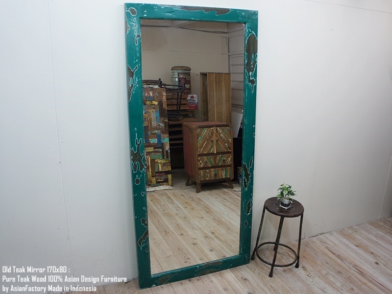 オールドチーク無垢材・姿見鏡170cm×80cmアンティークグリーン・緑色・全身ミラー・アジアン家具・古材 チーク材・木製フレーム・天然木・モダンアジアン・バリ家具・送料無料・*ウォルナット・マホガニーに並ぶ高級木材 業販 卸 スーパーセール 父の日