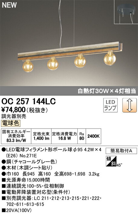商 品 詳 細商品名オーデリック インテリア 屋内 照明メーカー名オーデリック ODELICメーカー器具名称ペンダントライト(吊り下げ照明)仕様LED電球フィラメント形ボール球φ954.2W×4(E26)No.271E鋼(チャコールグレー色)木材(木調シート貼り)巾160 長945 高160 全高698-1,698 3.2o光源寿命15,000時間連続調光100-5%・位相制御電動昇降装置対応型(条件付)注意事項◆写真方向以外取り付け不可 ※施工・電気工事は専門業者にご依頼ください。